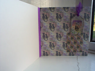 I made this card for my monthly card swap on the Joanna Sheen forum. The image is from the Pamela West cd by Joanna which is a delightful cd full of water coloured images. As a cat mad person I just love this image. I used a pearlescent stardream card in a very deep plum colour for the mats and layers and added a couple of flowers to the front to finish.